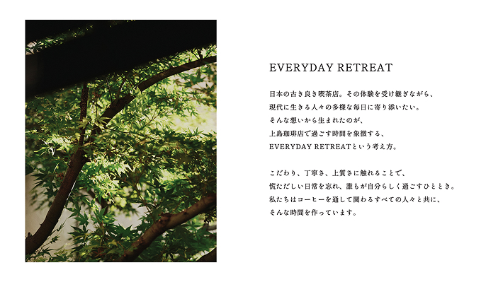 ステートメントの実現のために、上島珈琲店が日々提供する体験のあり方を「EVERYDAY RETREAT(毎日の中で自分らしさを取り戻す心の休息地)」と定義しました。