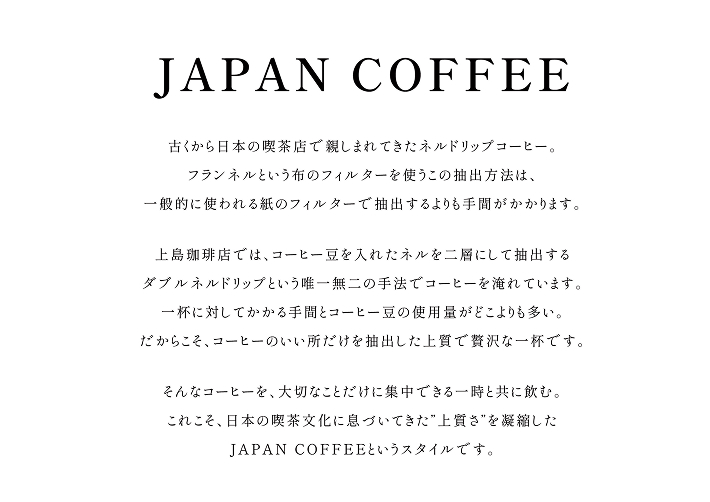 『JAPAN』とは、「ダブルネルドリップコーヒー」に、日本文化を代表する「南部鉄器」で沸かした白湯をアドオンした(加えた)まったく新しいスタイルのコーヒーです。「ダブルネルドリップコーヒー」に、口当たりが優しく柔らかな味わいの白湯が融合し、コク豊かでありながらも、優しくクリアな味わいを実現しています。他の誰にも真似できない一杯にこだわり続けた上島珈琲店の情熱が込められています。その一杯を、そしてその姿を、ぜひご堪能ください