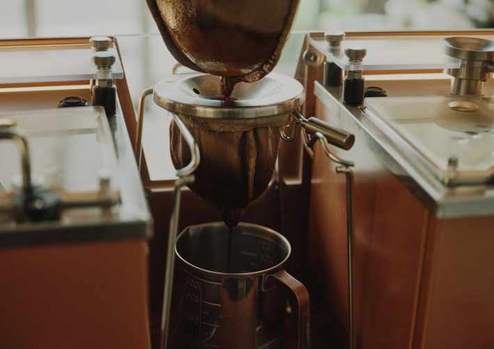 一層目の「ネル」で抽出されたコーヒーが、さらにもう一度、二層目のコーヒー粉を入れた「ネル」で抽出されることで、コーヒーのコク、甘味、旨味が凝縮され、コーヒーのいいところだけをギュッと抽出することができます。こうしてできた濃厚なコク、旨味を持つダブルネルドリップコーヒーは、ミルクを加えても、クリアな味わいを実現しており、上島珈琲店の「ミルク珈琲」メニューで使用されています。