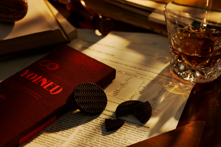 UCCは、カカオ豆からチョコレートを作る工程をヒントに、粉砕した豆とコーヒーオイルを油脂でコーティングし、フレッシュな香りを保持することを実現させる独自の製法を確立。『YOINED』は、この製法でコーヒー豆を抽出することなく、まるごと凍結粉砕し新鮮なまま香りも閉じ込めているため、“飲む”コーヒーでは味わえない、豆本来の甘み・酸味・苦味が作る芳醇な香りをダイレクトに感じられ、コーヒーの香りの余韻を余すことなく味わうことができます。「見た目はチョコなのに全然違う、コーヒーの香りがすごい!」と驚きの声を多くいただきますが、カカオ原料を一切使用していないため、チョコレートではありません。