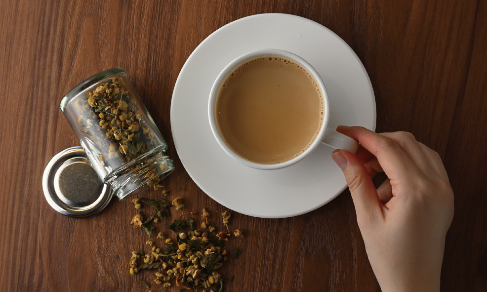 旨味がしっかりとありながらも、香りは柔らかな、上島珈琲店こだわりの「日本紅茶」に、カモミールとペパーミントをブレンドした「カモミールブレンド茶葉」を加え、店舗で丁寧に煮出しました。そこにミルクと和三蜜糖を合わせることで、やさしい香りとコクが心地よく広がる一杯に仕上げています。カモミールの深い香りに包まれながら、濃厚でまろやかなミルク紅茶で、癒しのひとときをお過ごしください。