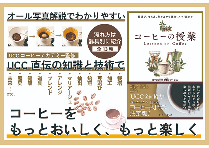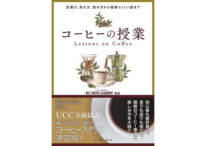 このたび、「UCCコーヒーアカデミー」の専任講師が、書籍「コーヒーの授業 ~豆選び、淹れ方、飲み方から健康にいい話まで~」の企画段階から携わり、取材・撮影に協力し、全ページにおいて監修いたしました。「コーヒーのおいしい淹れ方がわからない」「インスタントコーヒーからランクアップして、レギュラーコーヒーに挑戦してみたいけど、何から始めたらいいかわからない」「コーヒーを学んでみたいが、コーヒースクールに通うのはハードルが高い」……とお悩みの初心者のかたに、ぜひ手にとっていただきたい一冊です。