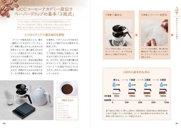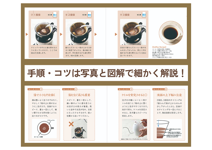 基本のハンドドリップなど、器具別の淹れ方は、写真解説付きで、わかりやすく収録。手順・コツは写真と図解で細かく解説しており、初心者のかたに向けて、ていねいに、わかりやすく解説しています。
