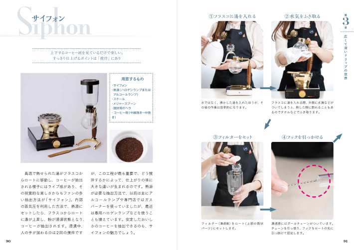 基本のハンドドリップなど、器具別の淹れ方(13種)は初心者のかたにもわかりやすく写真と図解で細かく解説!