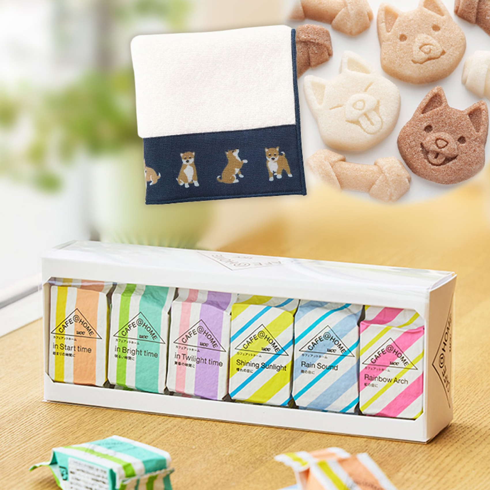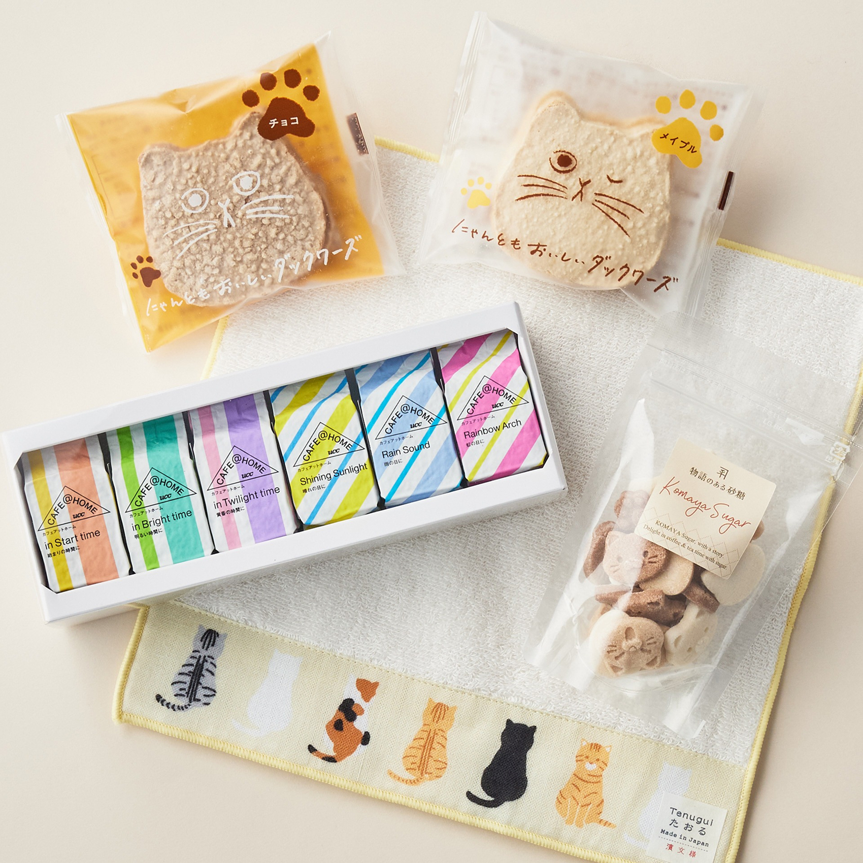 CAFE@HOMEの人気商品12種とスイーツ、猫のマグやタオルなどが詰め合わせになっている豪華なセット。