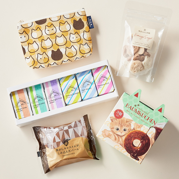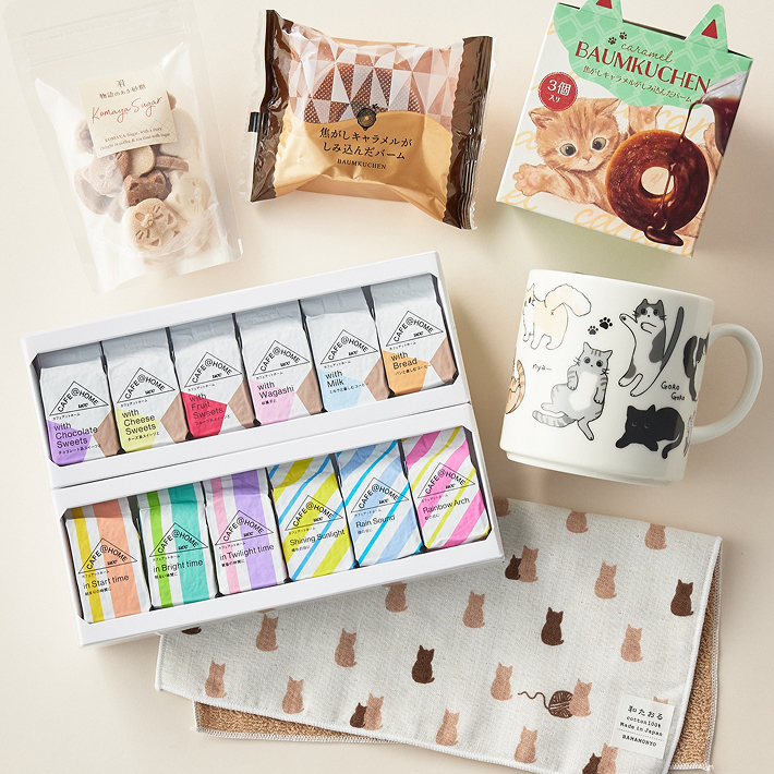 猫が大集合したマグには、きっとあなたの愛猫と同じ柄の子も見つかるかも?シルエットがかわいらしい猫柄の和たおるや、猫耳が付いたパッケージのスイーツも入っています。ご自分のごほうびにも、猫グッズに目がないあの人への贈り物にも。