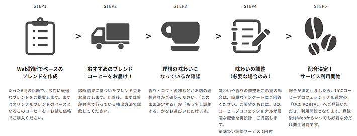 | STEP5(配合決定・発注) | ブレンド内容が決定後、サービス利用開始となります。以降はWEBからいつでも必要な分だけ発注が可能です。 ※ご導入後は、発注単位6kg(1袋あたりの内容量1kg、賞味期限4ヶ月 *5月以降出荷分から変更予定)からのお届けとなります。 ※サービスのご利用には、UCCコーヒープロフェッショナル運営の「UCC PORTAL」への登録が必要です。 |