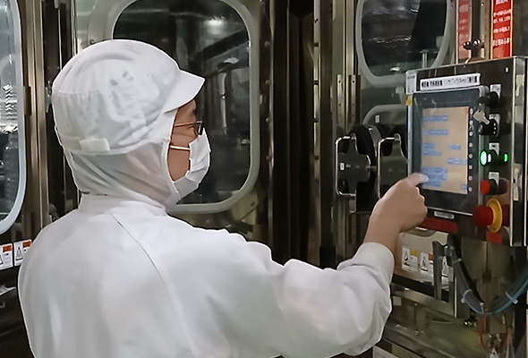 PETボトルの殺菌・充填ラインを担当しています。加熱による液体の殺菌処理を行い、無菌環境を保った充填機でペットボトルに液体を充填し、次の工程へ流す業務になります。自動化されたラインなので数値管理・設備管理・保全が基本的な業務内容です。お客様に「毎日同じ製品を作り続ける」ため、日々の管理を怠ることなく、些細な変化に気づけるよう細心の注意を払っています。