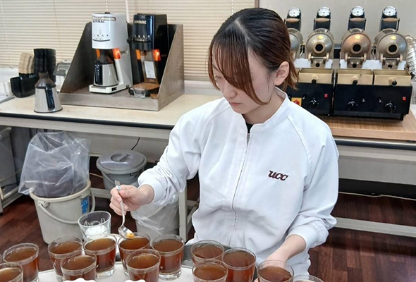 配属されて間もない頃は官能検査をしても味覚の違いが分からず、不安もありました。しかし、先輩方が丁寧に指導をしてくださり、日々コミュニケーションを取りながら特訓に付き合ってくださいました。加えて、UCCには挑戦を応援してくれる制度がたくさんあり、コーヒーの味覚に特化したカップテイスターと呼ばれる社内資格の研修を受ける機会を頂きました。コーヒー鑑定士の下で原料に関する知識と経験を得て力をつけることができ、今では異味異臭の有無や産地ごとの味覚の違いをしっかりと感じ取れるようになっています。また、先日カップテイスター試験にも合格したことで自身のスキルアップを改めて実感し、頑張ってよかった!と心から嬉しく思いました。
