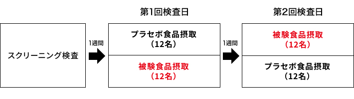 試験スケジュールを図1に示しました。第1回の検査日には、プラセボ食品先行摂取群はプラセボ食品を、被験食品先行摂取群は被験食品を摂取しました。第2回検査日には、プラセボ食品先行摂取群が被験食品を、被験食品先行摂取群はプラセボ食品を摂取しました。なお、各単回摂取検査日前1週間はウォッシュアウト期間としました。