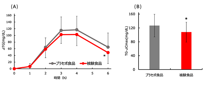 本試験では負荷食品摂取1、2、3、4、6時間後、および各被験者のTG最高血中濃度(以下、TG-Cmax)時点におけるTG変化量と負荷食品摂取前から摂取6時間後までのTG-iAUCを主要な評価項目として設定しました。