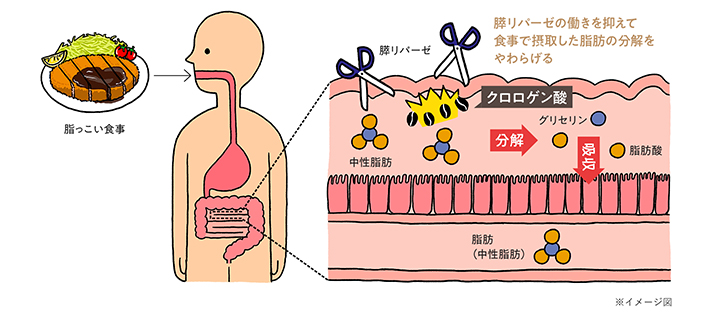 本機能の作用機序としては、UCCが過去に報告したコーヒー由来クロロゲン酸類が膵リパーゼ活性を阻害することで消化管での脂肪の分解を抑制するためであると推察しています(図3)。今回の知見を、食後TGの上昇抑制が期待出来るコーヒーの製品開発に応用し、コーヒーを通じて人々の健康に貢献して参ります。