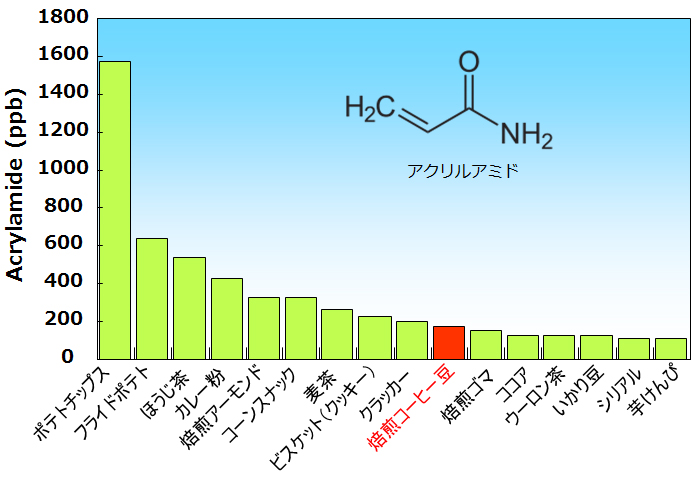 アクリルアミドとは、糖とたんぱく質の中のアスパラギンと呼ばれるアミノ酸が、加熱されたときに生成する物質です。アクリルアミドは世界保健機関(WHO)の外部組織である国際がん研究機関(IARC)によって、「ヒトに対しておそらく発がん性がある」と分類されている化合物で、2005年には、国際連合食糧農業機関(FAO)とWHOからなる合同委員会が「食品中のアクリルアミドは健康に害を与える恐れがあり、含有量を減らすべき」という勧告を発しました。図1は、日常的に摂取している食品中のアクリルアミドを表していますが、やはり糖とたんぱく質の含まれる食品を揚げる・焼くなどの加熱方法で調理した食品に多く含まれています。コーヒー豆は比較的アクリルアミドの含有量が少ないものの、一日の摂取頻度が高いのが特徴です。同じ製品でも原料や加工条件等々の違いにより、アクリルアミドの含有量には大きな変動があり、また伝統的に食べられてきた食品も多く、どの程度体への悪影響があるのかも不明な点が多いといわれています。