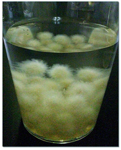 次に麹菌をどのようにコーヒーに作用させるか検討を行ったところ、予め担体に麹菌を生育させるとアクリルアミドを分解するアミダーゼの酵素活性が高いことがわかりました。そこでセルロース繊維を担体とし、これに麹菌を生育させ、これをコーヒー抽出液に一定時間添加、その後麹菌を回収する方法を考案しました。担体上に生育した菌糸は図2のようになります。これを、抽出したコーヒーに添加し、35℃で反応させました。反応前を0時間とし、1、3、6、16時間後にコーヒーを採取して、そのコーヒーの評価を行いました。