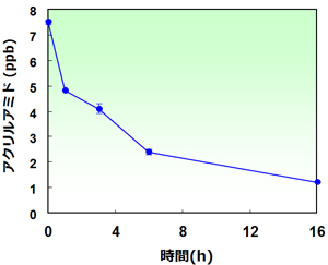 図3は麹菌処理の時間とコーヒー中のアクリルアミド量の変化をみたものです。市販の無糖ブラック缶コーヒー程度の濃度のコーヒーで実験したところ、麹菌を添加するとアクリルアミドは約84%分解しました。コーヒーの濃度や麹菌の添加量によってアクリルアミド分解のスピードは異なってくることもわかりました。