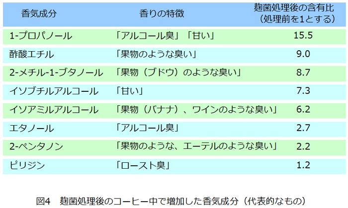 コーヒーに含まれる代表的な香気成分(50種類)を測定した中では、特に1-プロパノール(15.5倍)、酢酸エチル(9倍)、2-メチル-1-ブタノール(8.7倍)が増加しました(図4)。一般的にこのようなアルコール類、エステル類とよばれる香気成分は主として「アルコール様」「フルーツ様」「甘い香り」といった香気であり、コーヒーにももともと入っているものですが、麹菌処理により著しくそれらの含有量が増加したため、これら香気物質は麹菌の作用によりコーヒー中に新たに放出されたものと考えられます。