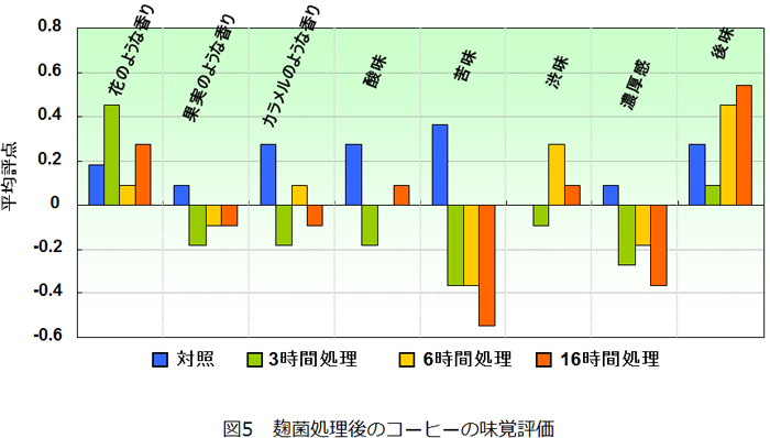 実際にパネリストが麹菌処理したコーヒーを飲み、味覚を評価しました。その結果、麹菌処理することによって「花のような香り」が増加する傾向にあり、麹菌の処理時間が長くなるほど苦味、濃厚感の評点が低くなり、パネリストは軽い風味のコーヒーとして評価しました(図5)。また、「日本酒や甘酒を連想させる香り」「アルコールを感じる香り」があると回答しました。麹菌処理後のコーヒーにはアルコール類、エステル類などが増加していたため、これらの成分が味覚評価に影響を与えたと考えられます。この実験結果より、麹菌の処理時間や添加量などを調節することによって、香気成分や味覚をコントロールしながら、コーヒーの製品開発ができると考えられました。