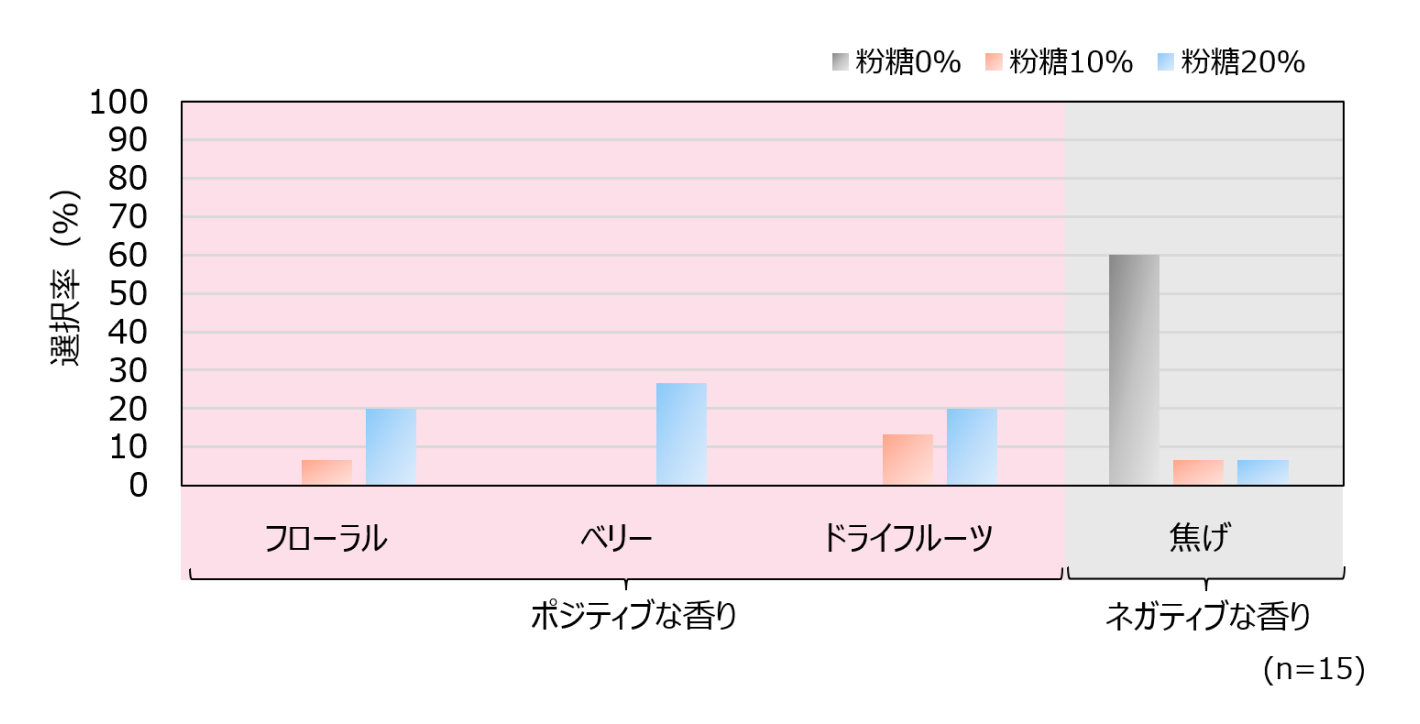 粉糖の配合が多いほど、フローラル、ベリー、ドライフルーツといったポジティブな香りを選択する人が多かった一方で、粉糖が全く含まれていないと、焦げ臭のようなネガティブな香りを選択する人が多かったです。