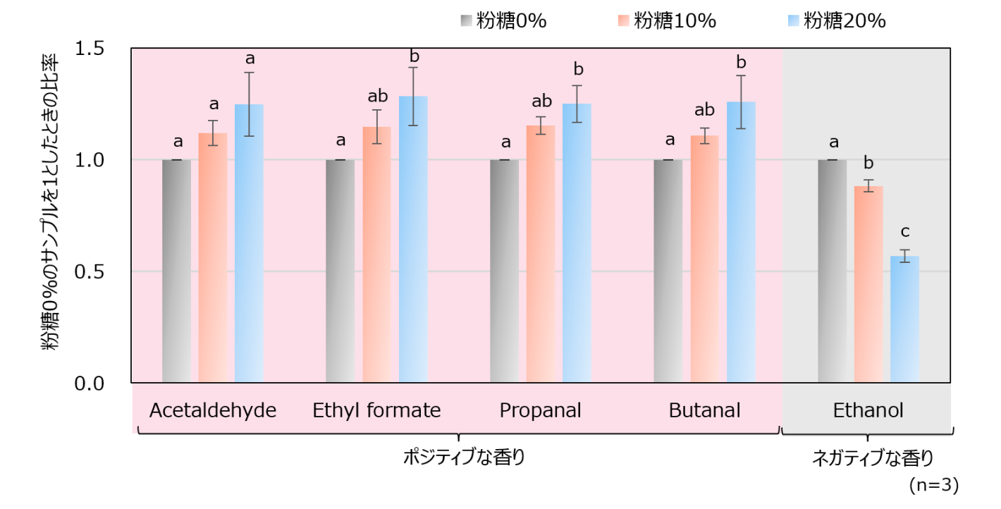 CATA法による香りの評価の結果同様、粉糖の配合が多いほど、ポジティブな香気成分が多く、ネガティブな香気成分が少ない傾向でした。