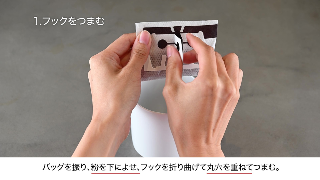 バッグを振り、粉を下によせ、フックを折り曲げて丸穴を重ねてつまみます。