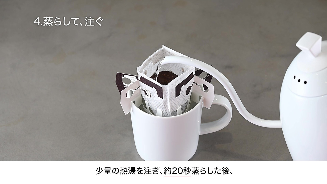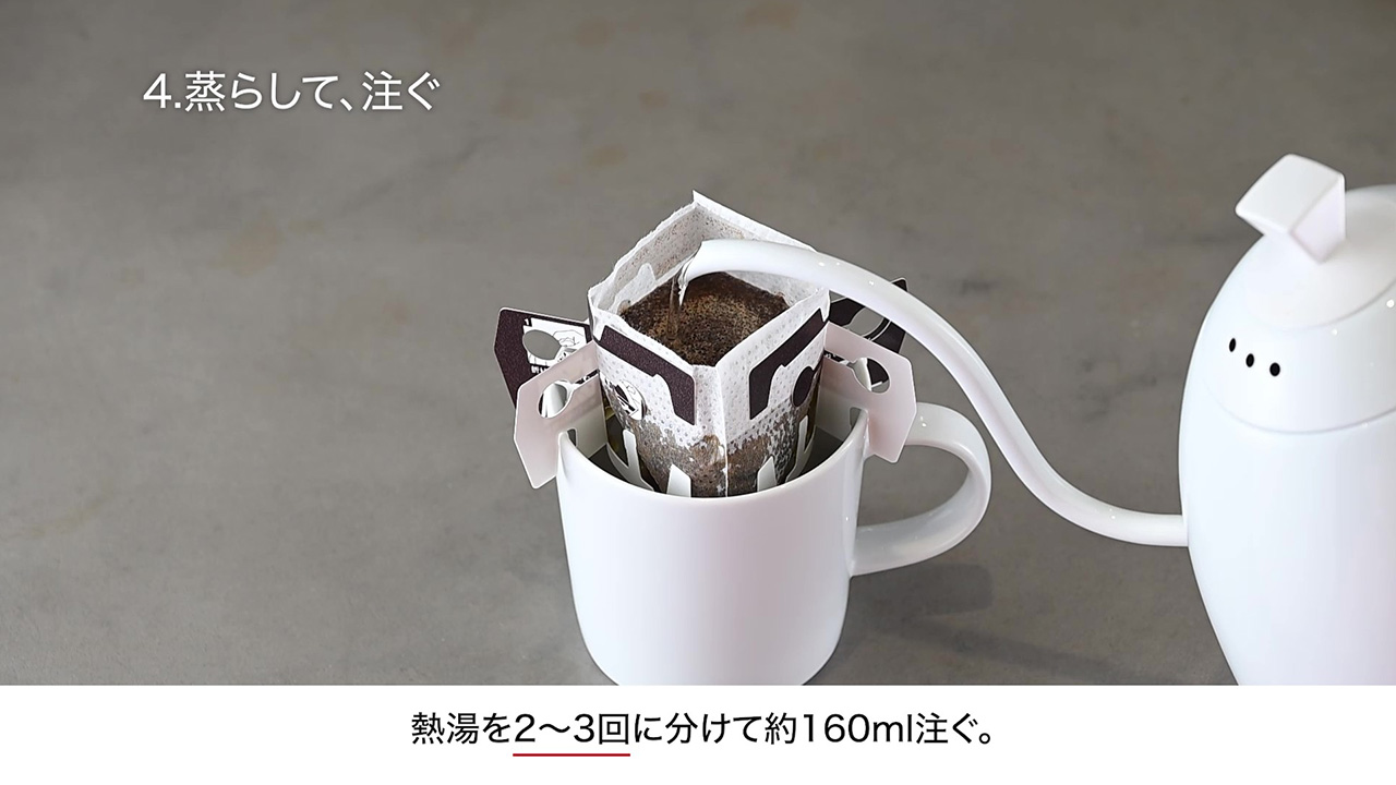 少量の熱湯を注ぎ、約20秒蒸らした後、熱湯を2~3回に分けて、約160ml注ぎます。
