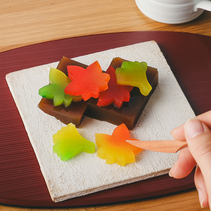 それぞれのようかんが固まったら、コーヒーようかんは半分に切り、紅葉ようかんは型で抜いて飾って、できあがり。