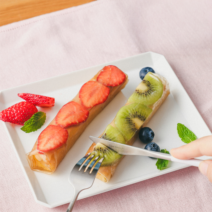 カステラと少し間をあけて、奥にスライスしたフルーツを並べる。