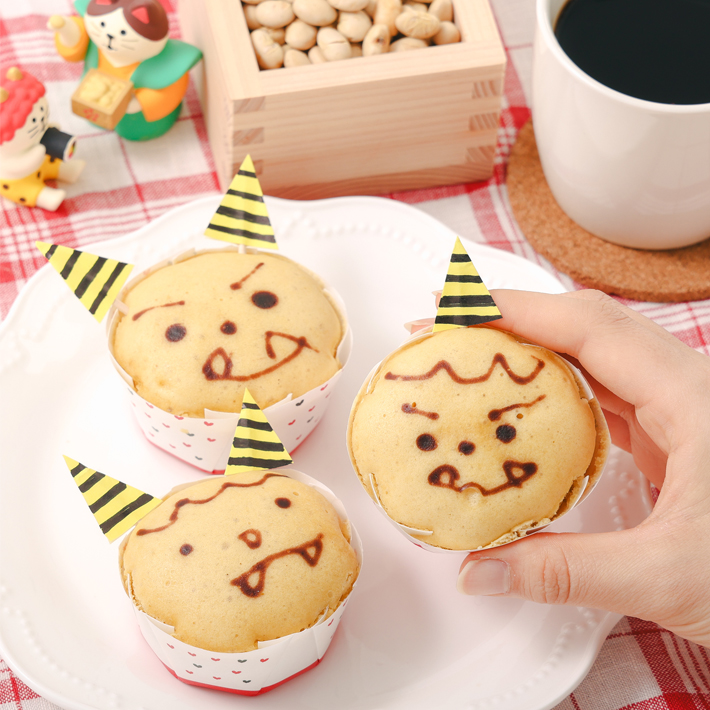 [5]を絞り袋に入れて、カップの生地に鬼の顔をデコレーションする。